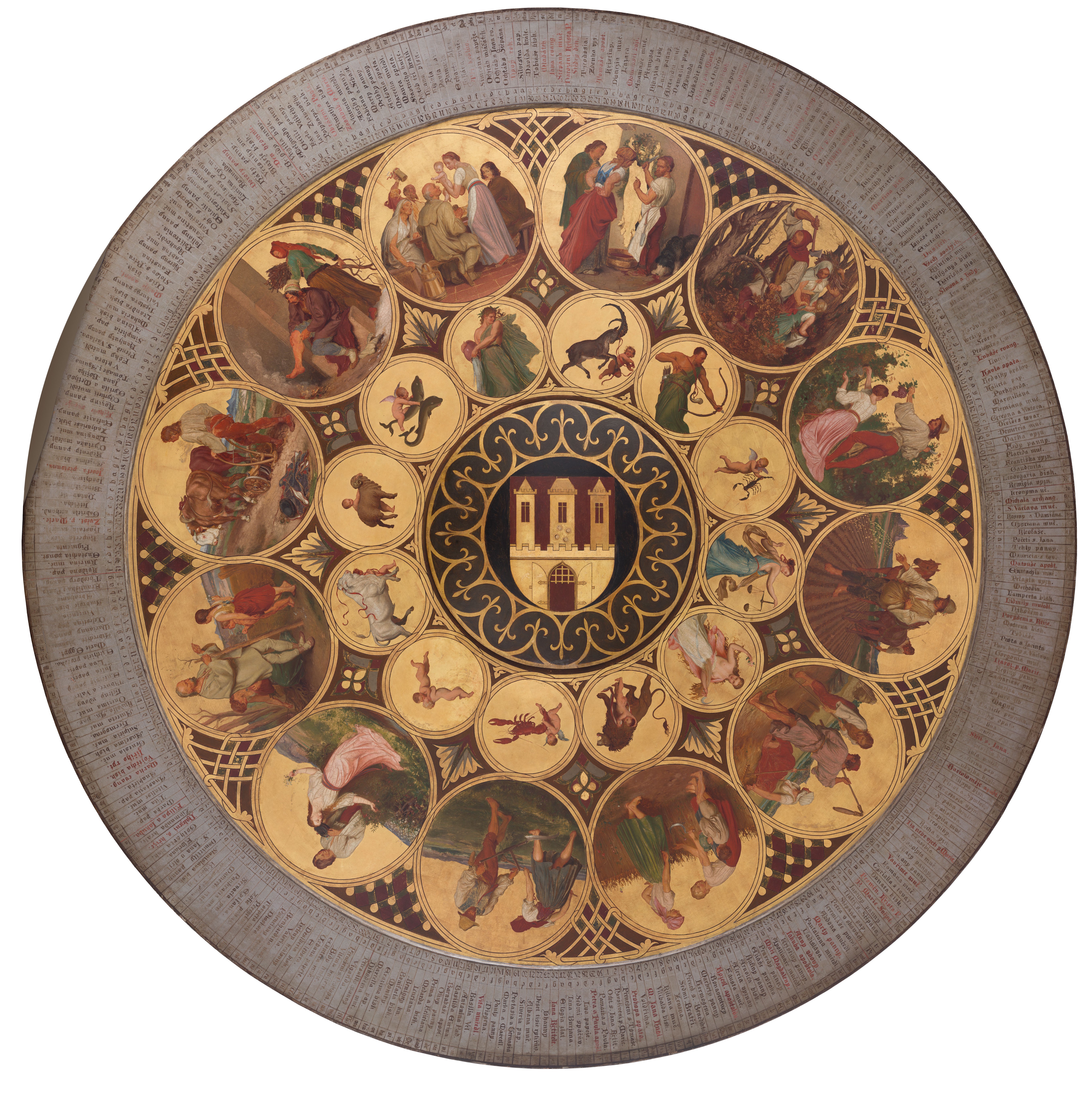 The lower circle of the astronomical clock shows the months, public holidays and signs of the zodiac, accompanied by allegorical representations of the seasons and rural activities. Its current appearance was designed by the painter Josef Mánes in 1866. This model depicts the original, which is kept in the Prague Museum; a copy is displayed in the Old Town Hall.